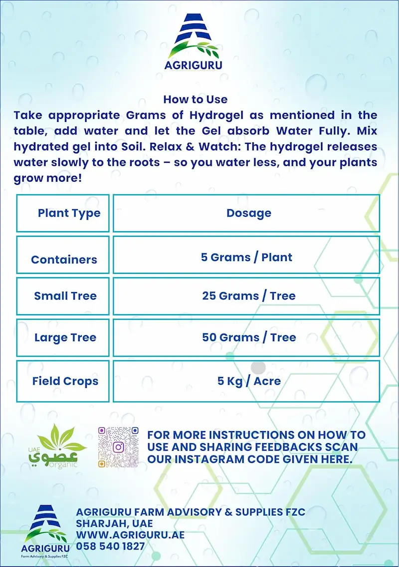 Agriguru Organic Hydrogel is non-toxic, eco-friendly, and safe for all plants. It is suitable for use in potted plants, lawns, landscaping, vegetable gardens, fruit trees, nurseries, and agricultural fields. It is especially beneficial in sandy soils, dry climates, and areas with limited water availability.