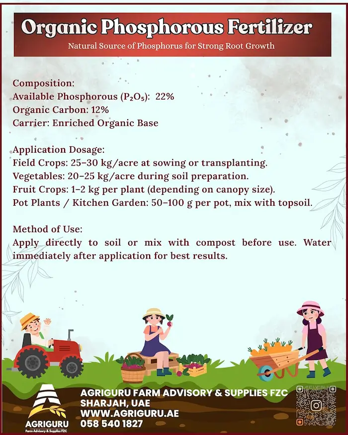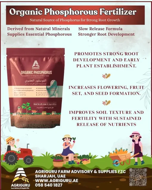Agriguru Organic Phosphorus is a premium organic fertilizer specifically formulated to deliver plant-available phosphorus in a natural and sustainable form. Phosphorus is a critical macronutrient responsible for energy transfer, root development, flowering, and fruit formation. This product is designed to address phosphorus deficiencies while improving overall soil health without harming beneficial microorganisms.