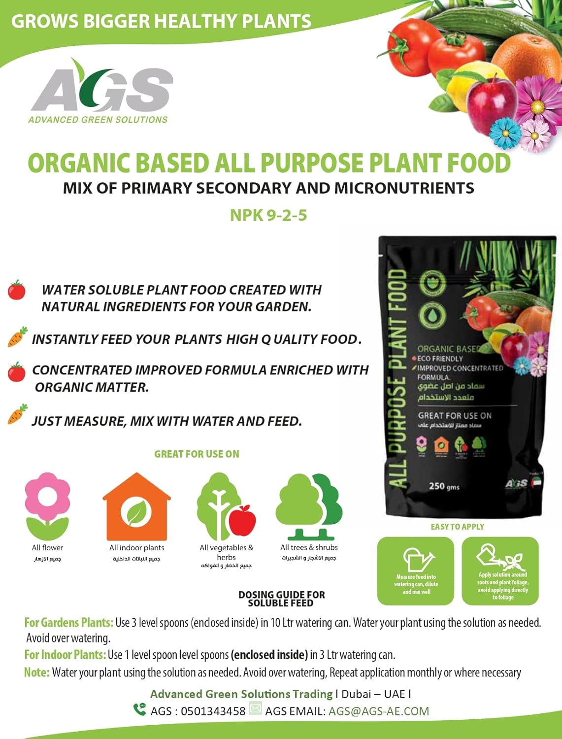 AGS Organic Based All Purpose Plant Food NPK 9-2-5 – Water Soluble Fertilizer for Flowers, Vegetables & Indoor Plants (250g)