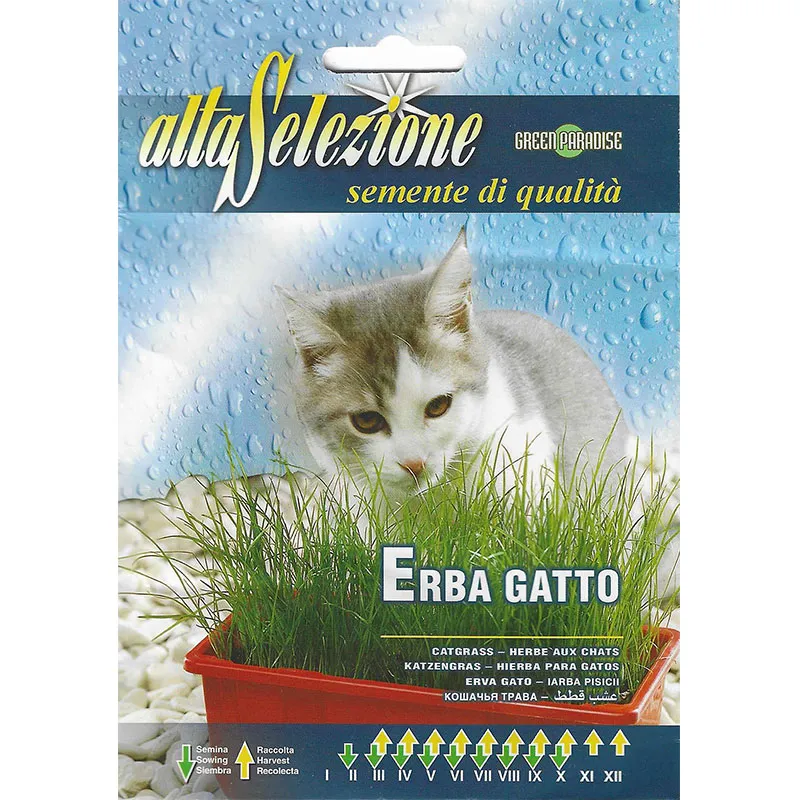 Grow fresh and nutritious catgrass with Alta Selezione Catgrass Premium Quality Seeds (Erba Gatto). A natural treat that promotes feline well-being and aids digestion.