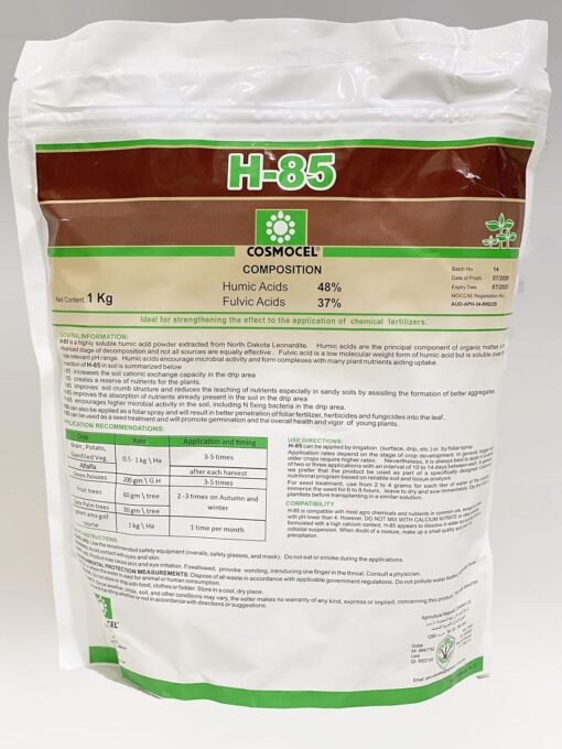 COSMOCEL® H-85 is a premium-grade soil amendment composed of 48% humic acid and 37% fulvic acid, extracted from natural sources and specially formulated to enhance soil structure, increase nutrient uptake, and boost crop productivity. Ideal for use in a wide range of crops and soil conditions, this water-soluble granular formulation improves root development, plant metabolism, and the efficiency of fertilizers applied in conjunction.