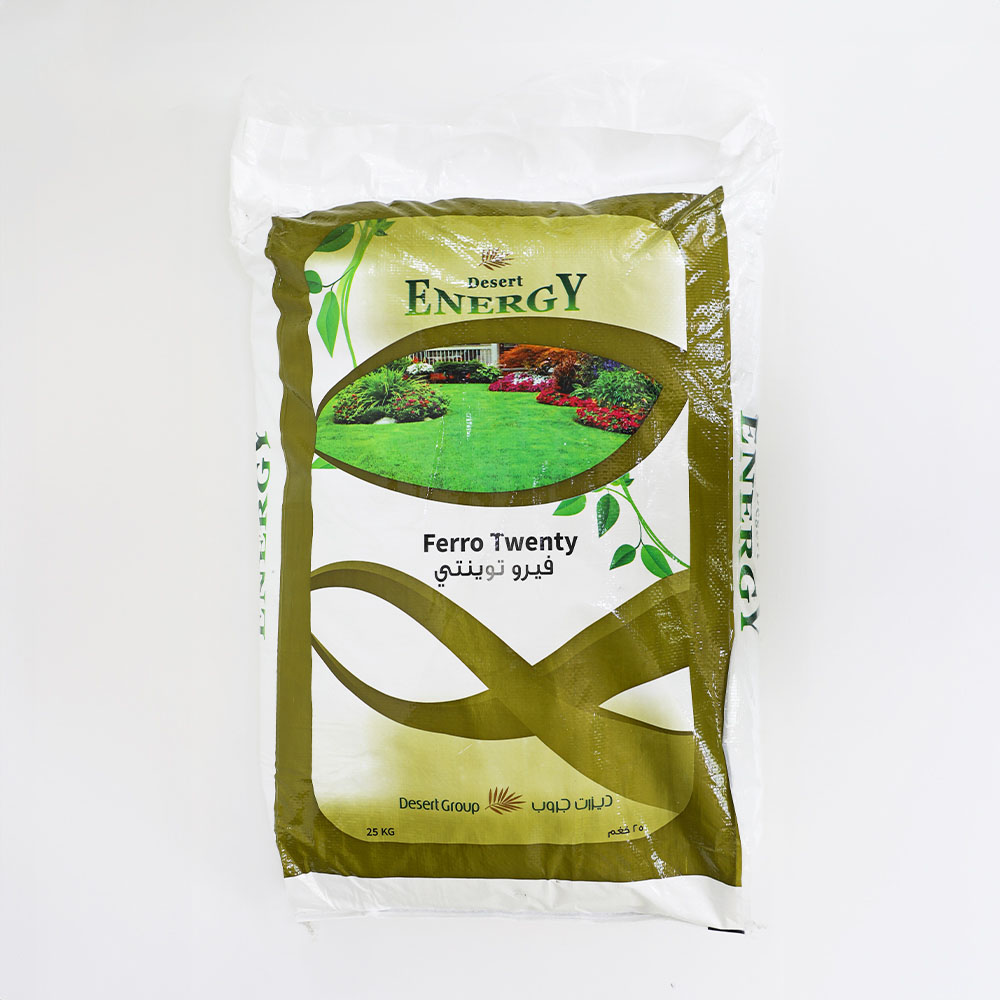 Desert Energy Ferro 20 is a highly soluble and stable form of ferrous sulphate hepta-hydrate (20% Fe), designed for correcting iron deficiency and enhancing the deep green color of turf, lawns, ornamentals, and landscape plants. Its fine powder formulation dissolves easily in lukewarm water, ensuring superior absorption compared to standard iron sulphate products. Ferro 20 provides dual benefits—supplying essential iron and sulphur while also helping reduce alkaline soil and water pH. Ideal for treating iron chlorosis, improving root activity, and promoting stronger, greener growth in UAE’s high-pH soils.