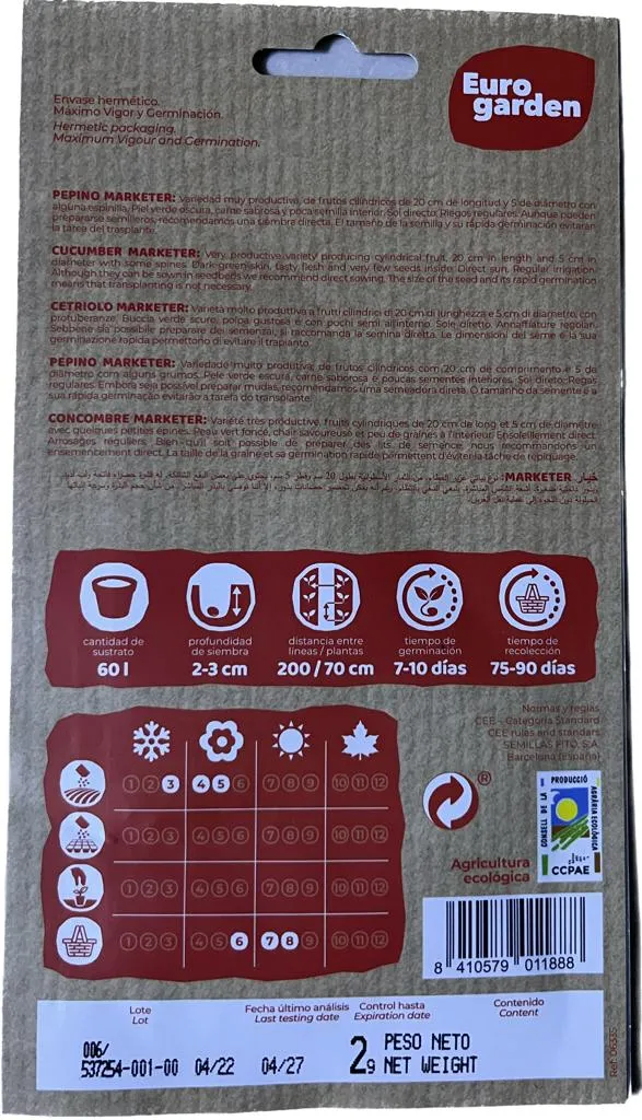 Eco Organic Pepino Marketer cucumber seeds produce high-quality, smooth-skinned cucumbers with a refreshing, crisp texture. Ideal for home gardens, these seeds are perfect for container planting or outdoor garden beds, providing a fresh and sustainable source of cucumbers.