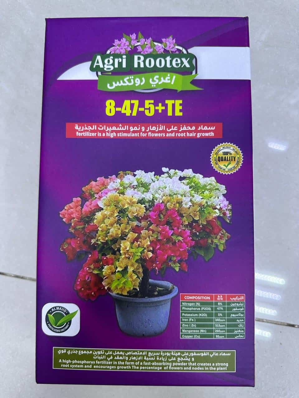 This is Agri Rootex 8-47-5+TE, a high-phosphorus fertilizer designed to stimulate flowering and root hair growth. It is in the form of a fast-absorbing powder that helps develop a strong root system and boosts flower production.