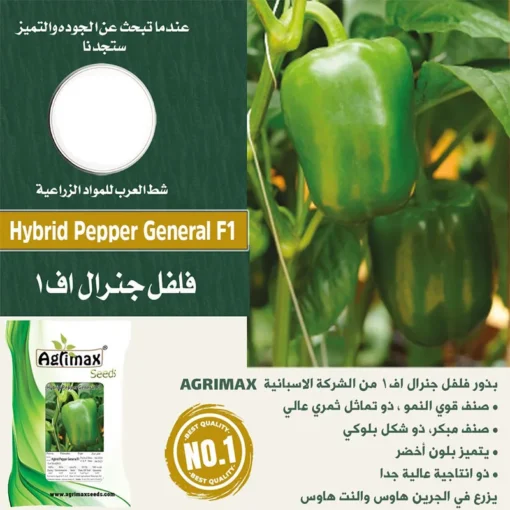 Grow Hybrid Green Pepper General F1, a high-yielding, disease-resistant variety producing large, thick-walled, and crisp bell peppers, perfect for cooking and salads.