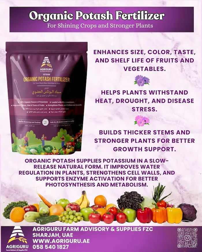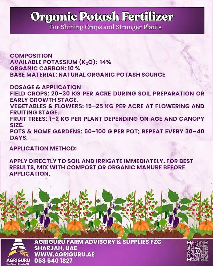 Organic Potash Fertilizer is a 100% natural source of potassium that improves flowering, fruiting, size, color, and taste of crops. It strengthens plants from root to fruit, enhances overall growth, and supports higher yields while remaining safe for all plants and soil-friendly.